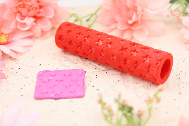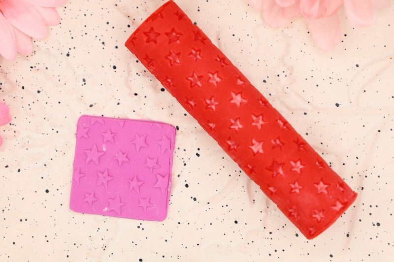 To use, roll out the clay to the required thickness. Place on a ceramic tile or your baking surface. Use a soft brush to cover the roller in cornstarch. Use some extra cornstarch and brush it on the top layer of your clay. Lightly tap off some of the excess cornstarch from the texture roller. With even and gentle pressure, roll your roller over the clay slab to get the desired effect.