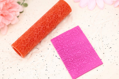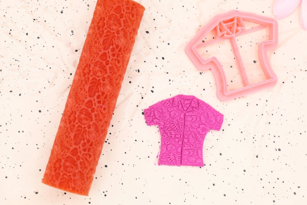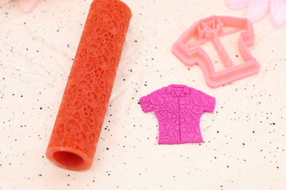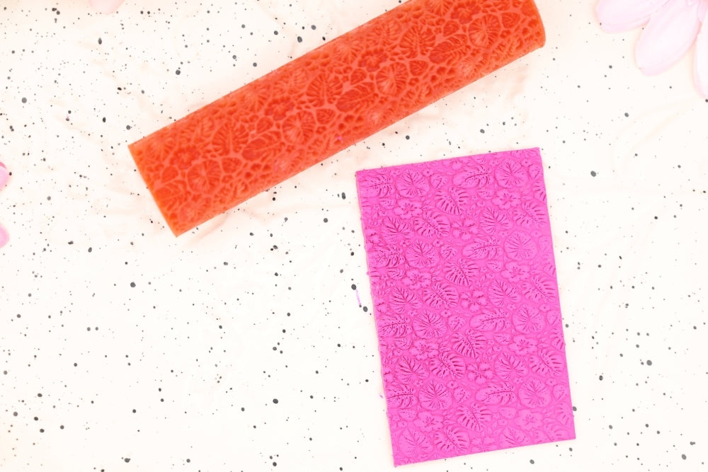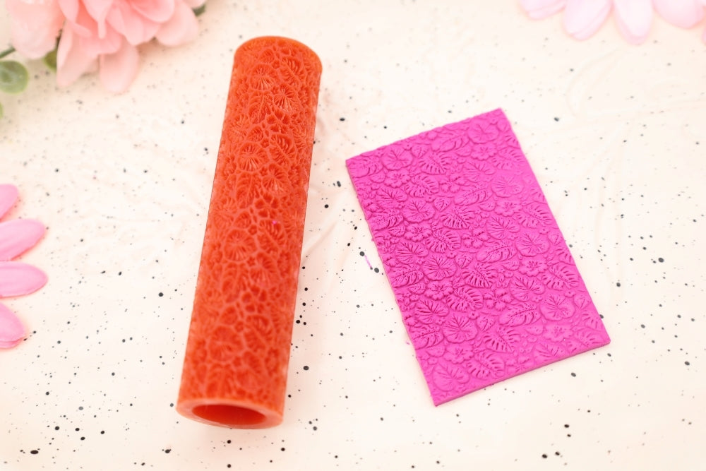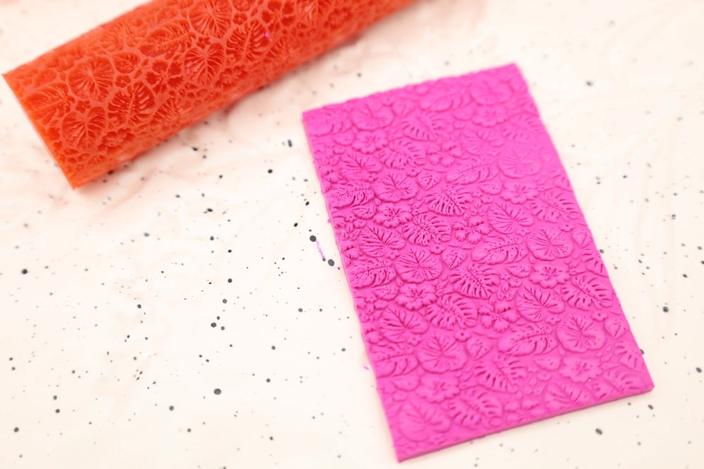 To use, roll out the clay to the required thickness. Place on a ceramic tile or your baking surface. Use a soft brush to cover the roller in cornstarch. Use some extra cornstarch and brush it on the top layer of your clay. Lightly tap off some of the excess cornstarch from the texture roller. With even and gentle pressure, roll your roller over the clay slab to get the desired effect.