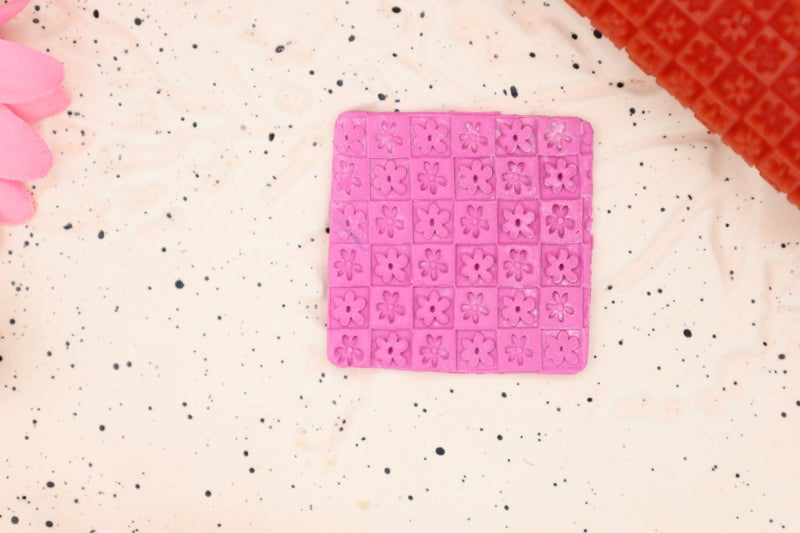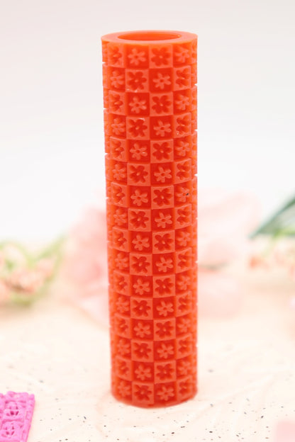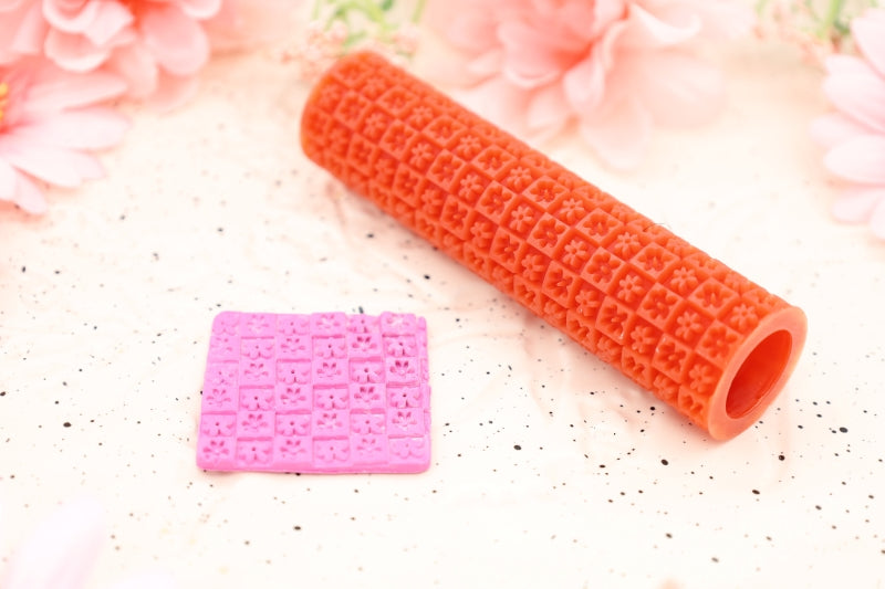 To use, roll out the clay to the required thickness. Place on a ceramic tile or your baking surface. Use a soft brush to cover the roller in cornstarch. Use some extra cornstarch and brush it on the top layer of your clay. Lightly tap off some of the excess cornstarch from the texture roller. With even and gentle pressure, roll your roller over the clay slab to get the desired effect.
