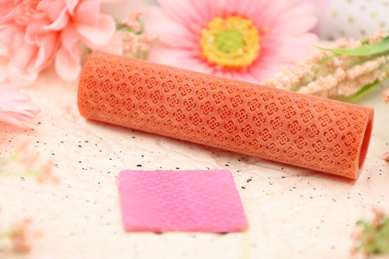 To use, roll out the clay to the required thickness. Place on a ceramic tile or your baking surface. Use a soft brush to cover the roller in cornstarch. Use some extra cornstarch and brush it on the top layer of your clay. Lightly tap off some of the excess cornstarch from the texture roller. With even and gentle pressure, roll your roller over the clay slab to get the desired effect.