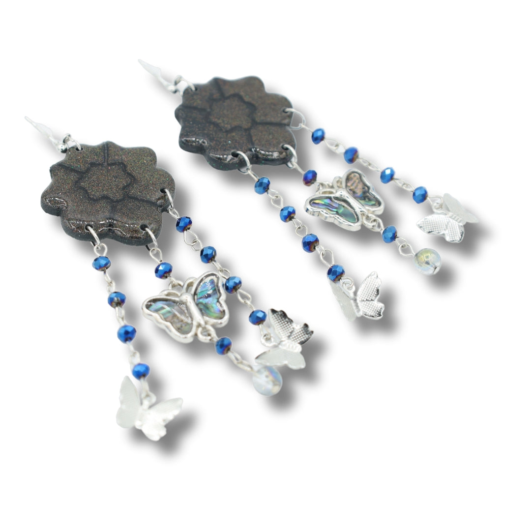 Black and blue Iridescent Butterfly Dangles- Handmade Polymer Clay Earrings