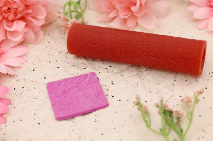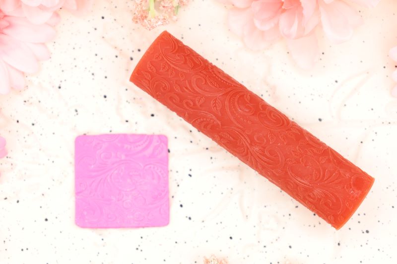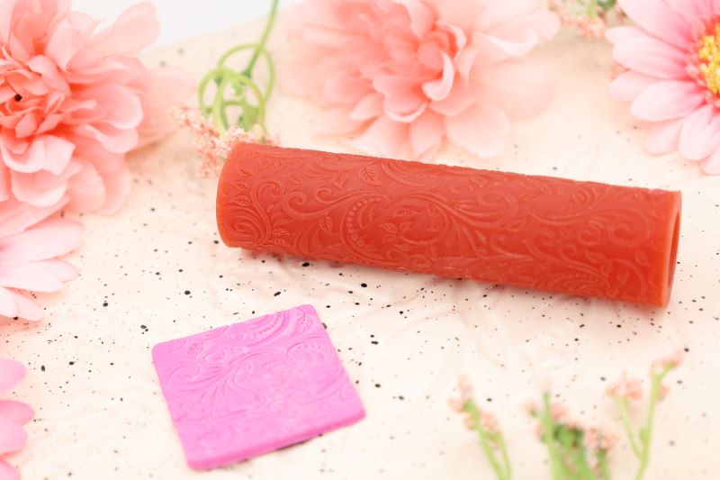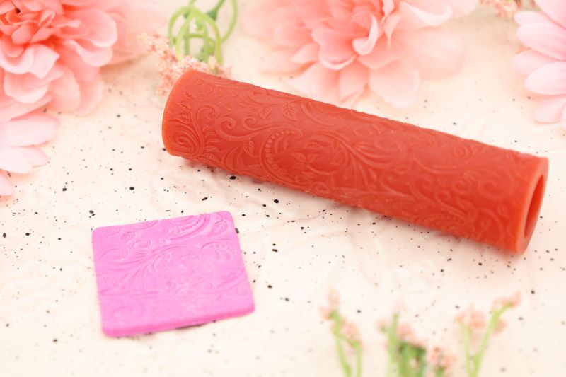 To use, roll out the clay to the required thickness. Place on a ceramic tile or your baking surface. Use a soft brush to cover the roller in cornstarch. Use some extra cornstarch and brush it on the top layer of your clay. Lightly tap off some of the excess cornstarch from the texture roller. With even and gentle pressure, roll your roller over the clay slab to get the desired effect.