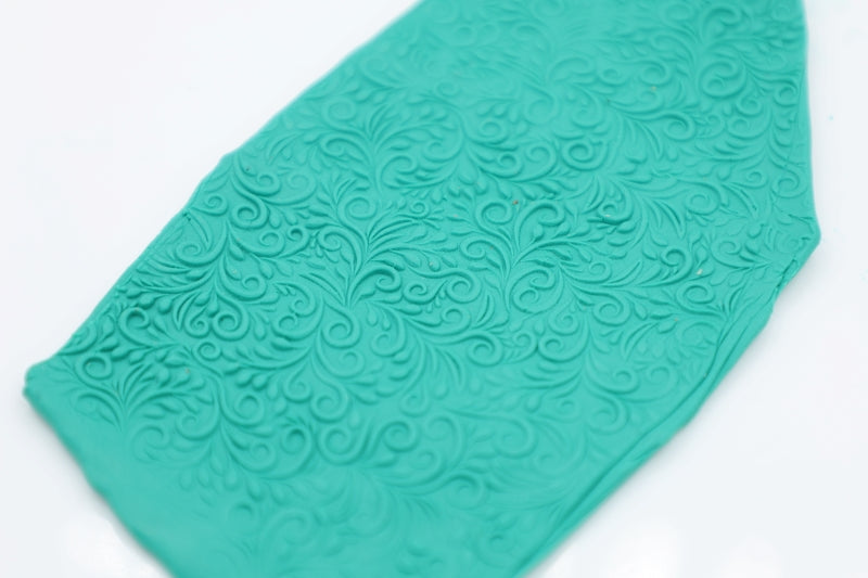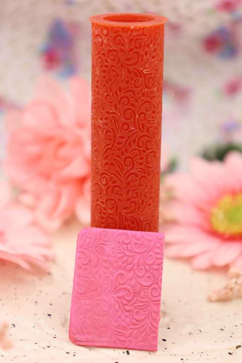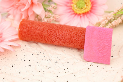 To use, roll out the clay to the required thickness. Place on a ceramic tile or your baking surface. Use a soft brush to cover the roller in cornstarch. Use some extra cornstarch and brush it on the top layer of your clay. Lightly tap off some of the excess cornstarch from the texture roller. With even and gentle pressure, roll your roller over the clay slab to get the desired effect.