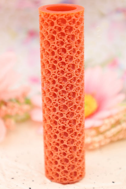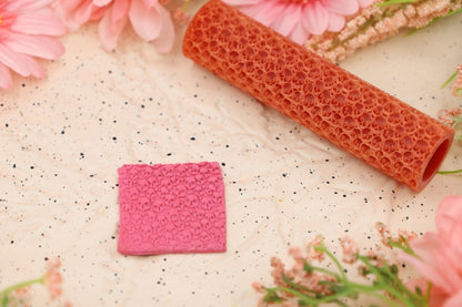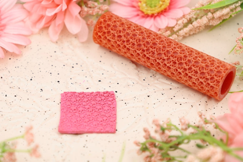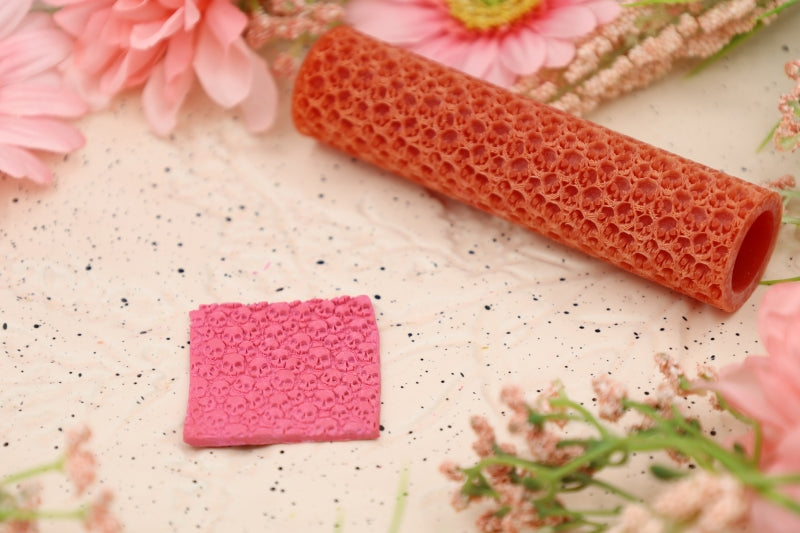 To use, roll out the clay to the required thickness. Place on a ceramic tile or your baking surface. Use a soft brush to cover the roller in cornstarch. Use some extra cornstarch and brush it on the top layer of your clay. Lightly tap off some of the excess cornstarch from the texture roller. With even and gentle pressure, roll your roller over the clay slab to get the desired effect.
